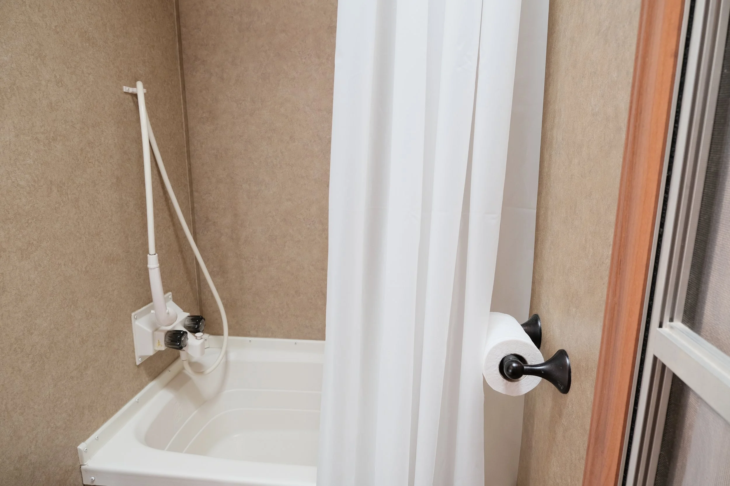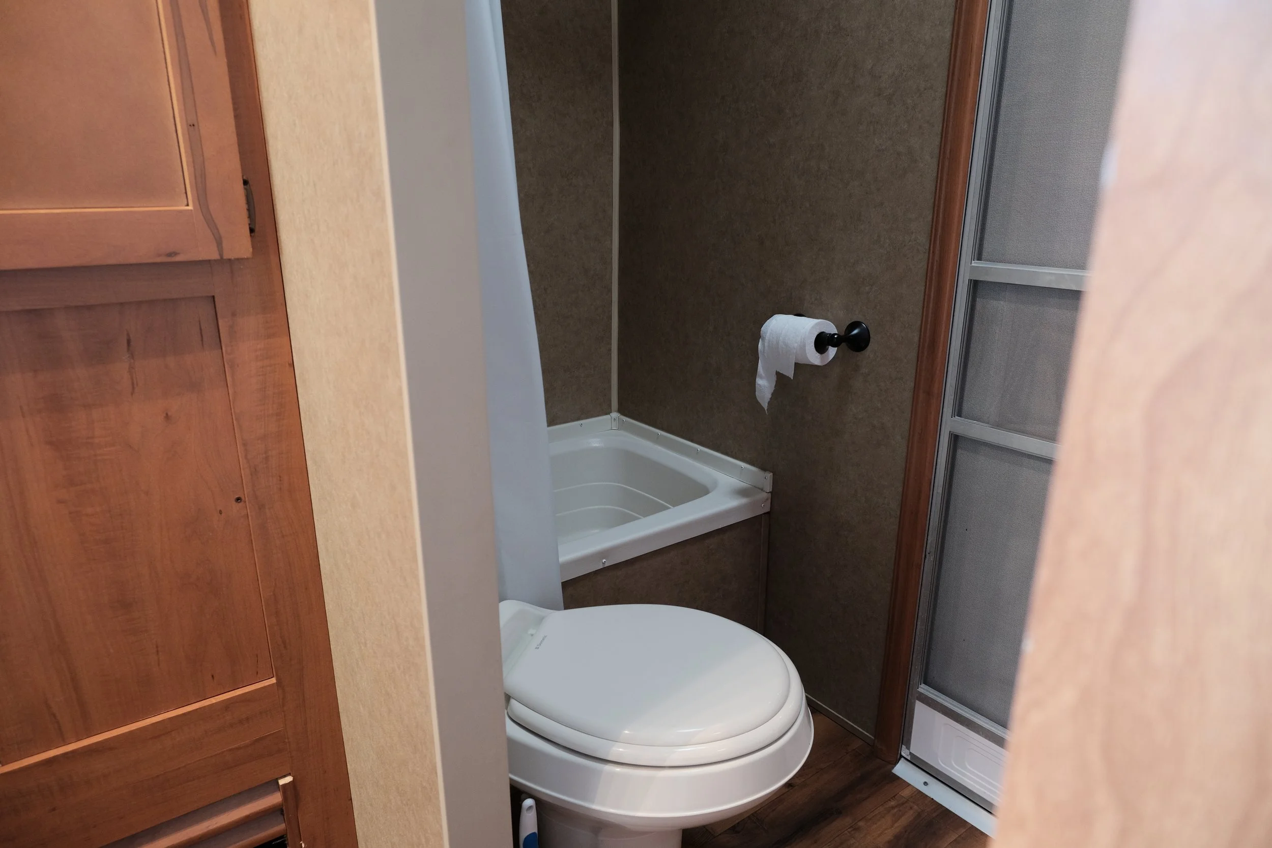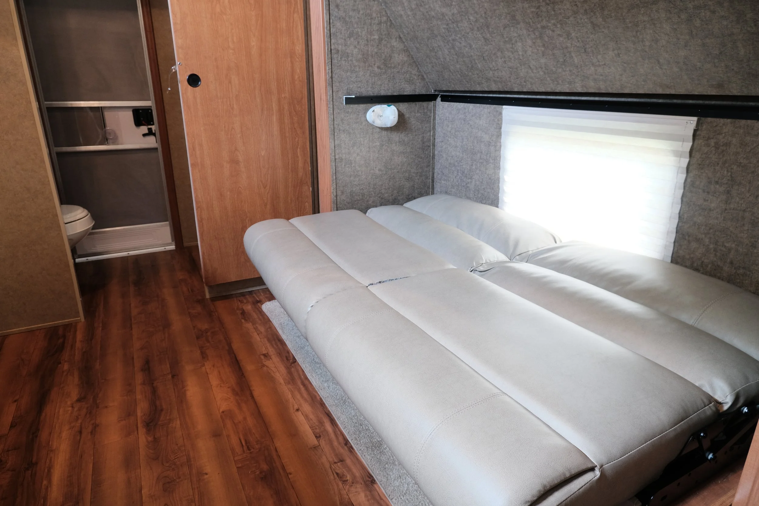 There is an additional entrance at the end of the camper leading to a private bathroom with a shower. It connects to a children's bedroom featuring bunk beds and a fold-down couch, suitable for couples as well. This room can also be accessed from the kitchen/dining area. The unit has a calming atmosphere with neutral colors and plenty of natural light. It is situated on a private lot near our pond and includes a paved parking area. Outside, you can relax under the awnings and enjoy a picnic table. A large fire pit is available for your family's enjoyment at night. Heating and air conditioning are provided for seasonal comfort.