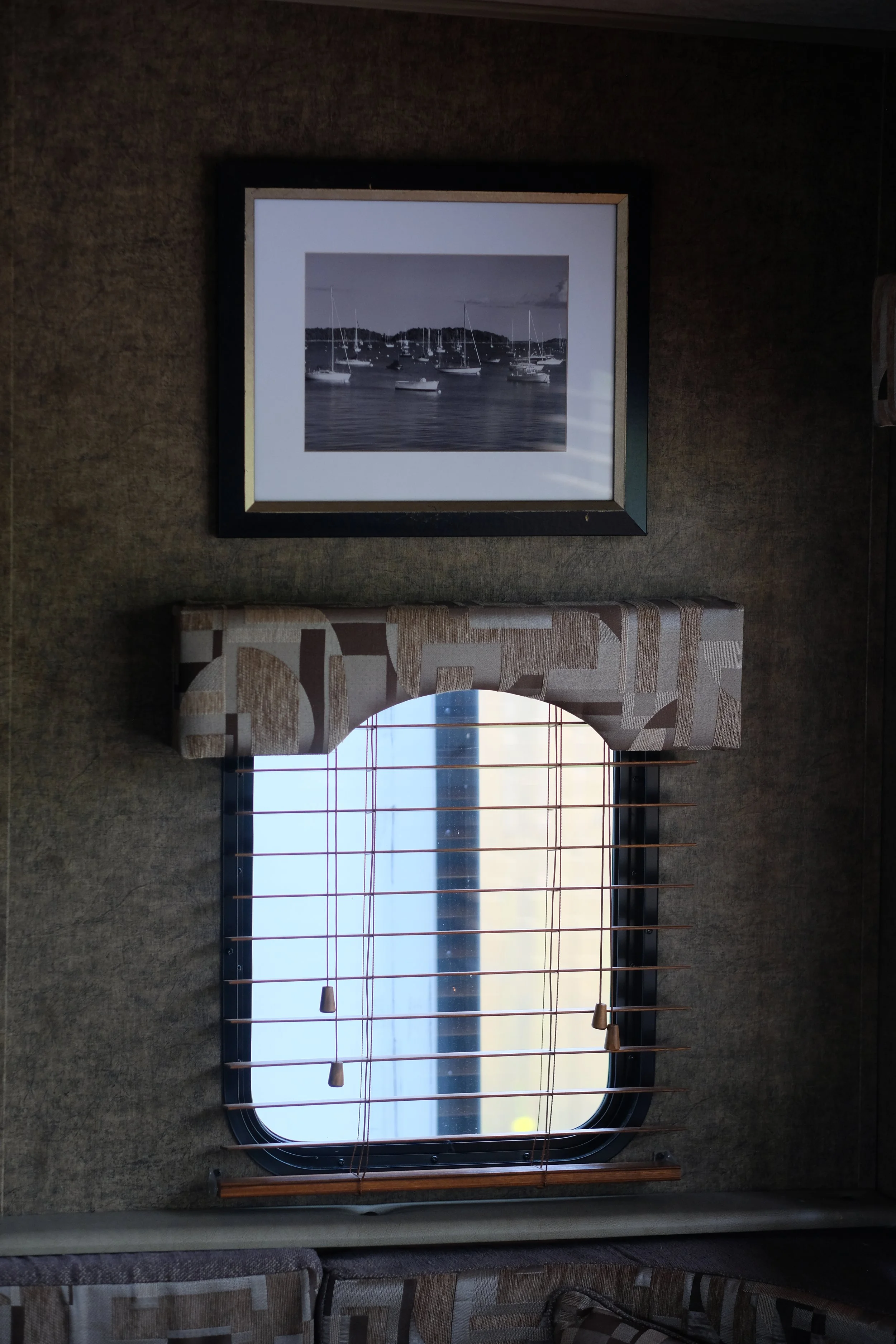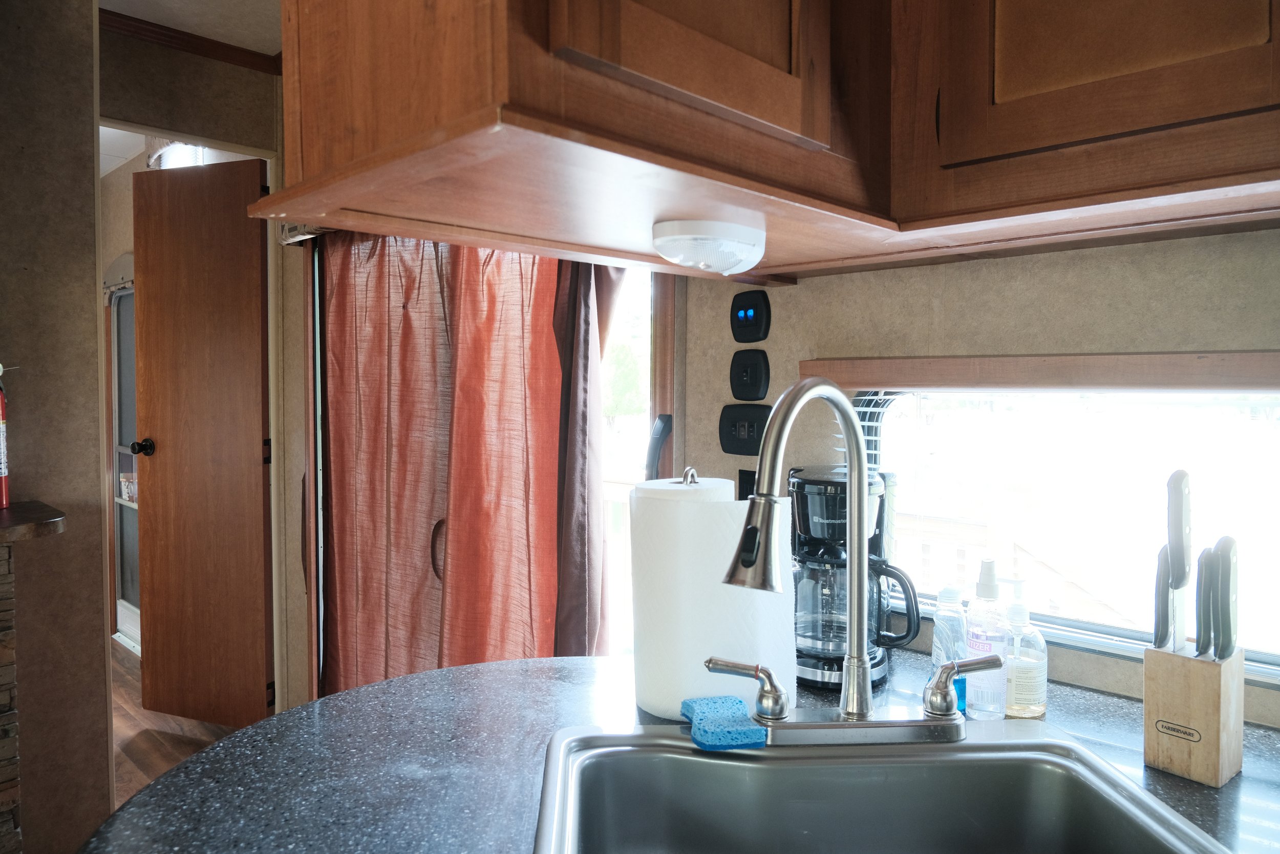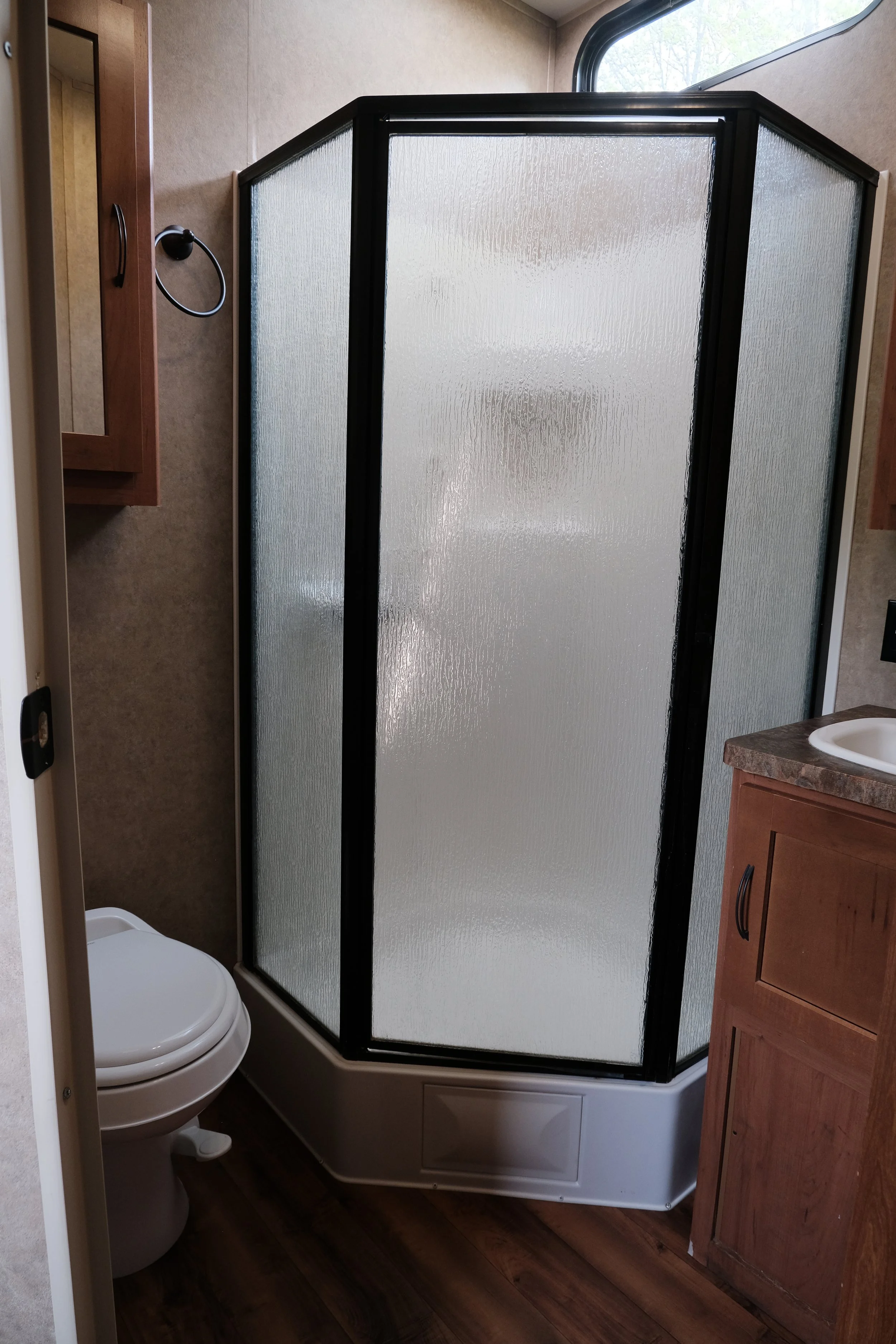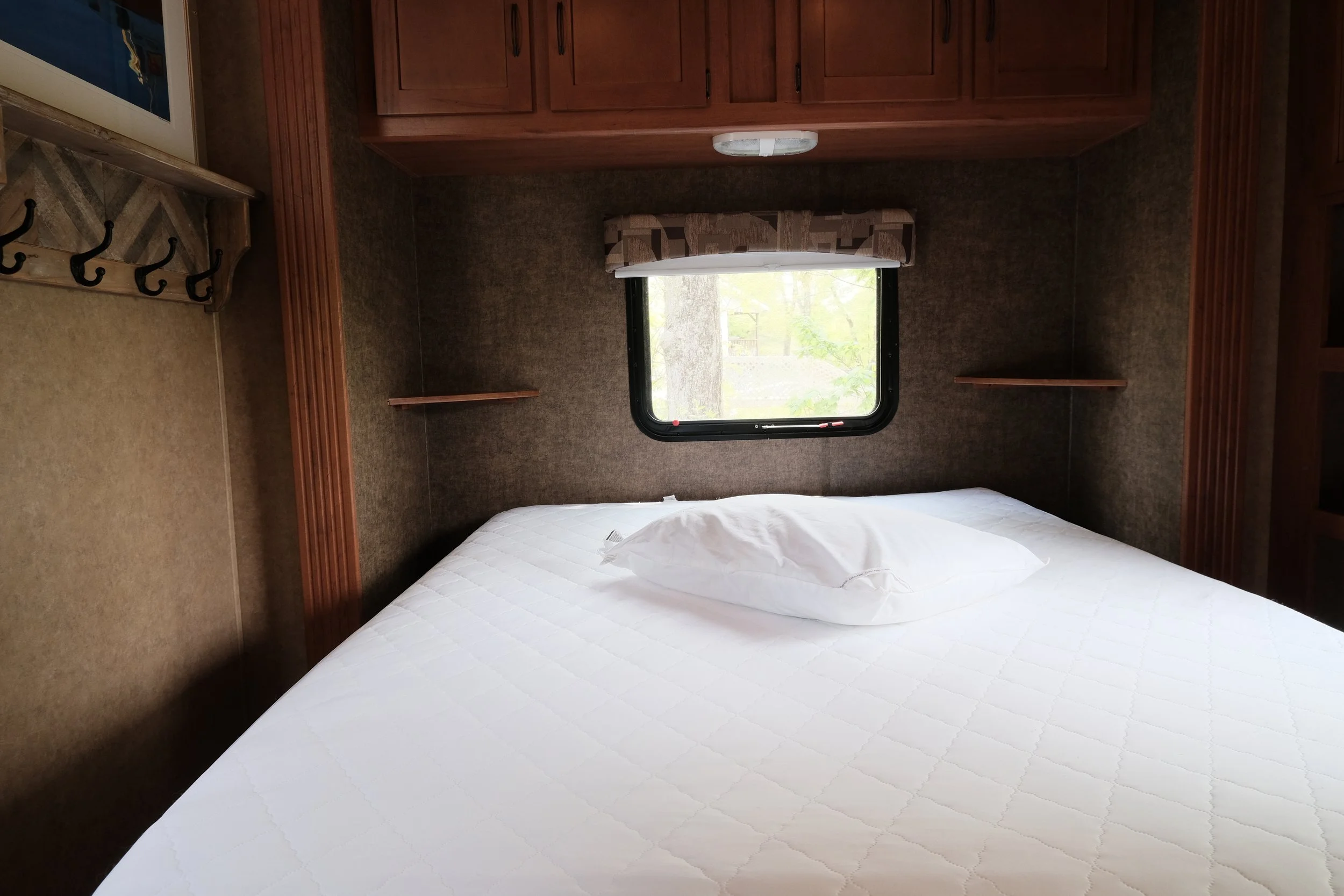 There is an additional entrance at the end of the camper leading to a private bathroom with a shower. It connects to a children's bedroom featuring bunk beds and a fold-down couch, suitable for couples as well. This room can also be accessed from the kitchen/dining area. The unit has a calming atmosphere with neutral colors and plenty of natural light. It is situated on a private lot near our pond and includes a paved parking area. Outside, you can relax under the awnings and enjoy a picnic table. A large fire pit is available for your family's enjoyment at night. Heating and air conditioning are provided for seasonal comfort.