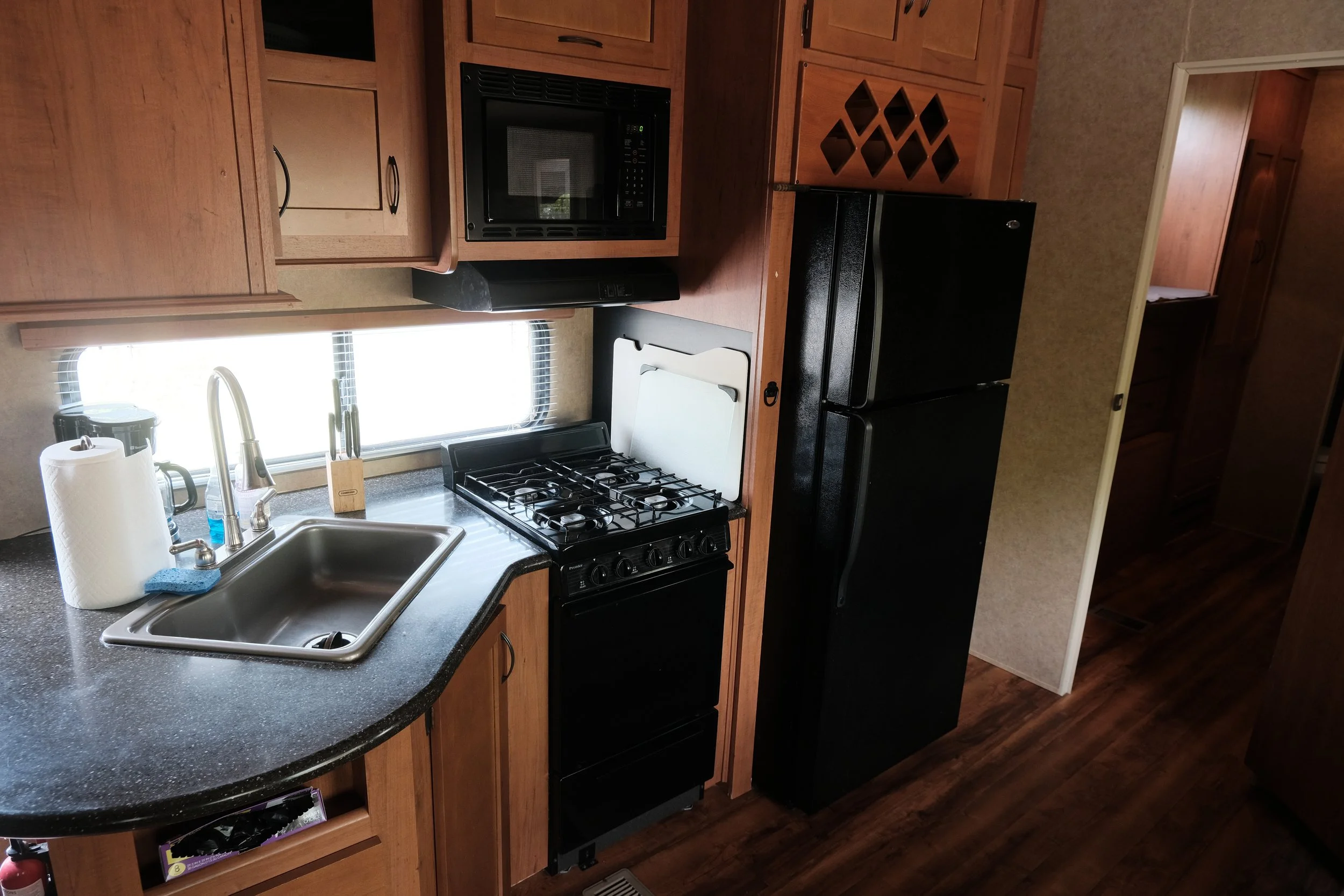 Our park model offers a queen size private bedroom with a bathroom, ceiling fan, and ample storage. There is a vanity area for personal grooming. The living room and kitchen have an open concept layout, with convertible beds in the couch and table. A stone fireplace with a flat screen TV is positioned above. The kitchen is equipped with a full refrigerator, gas stove/oven, and microwave…