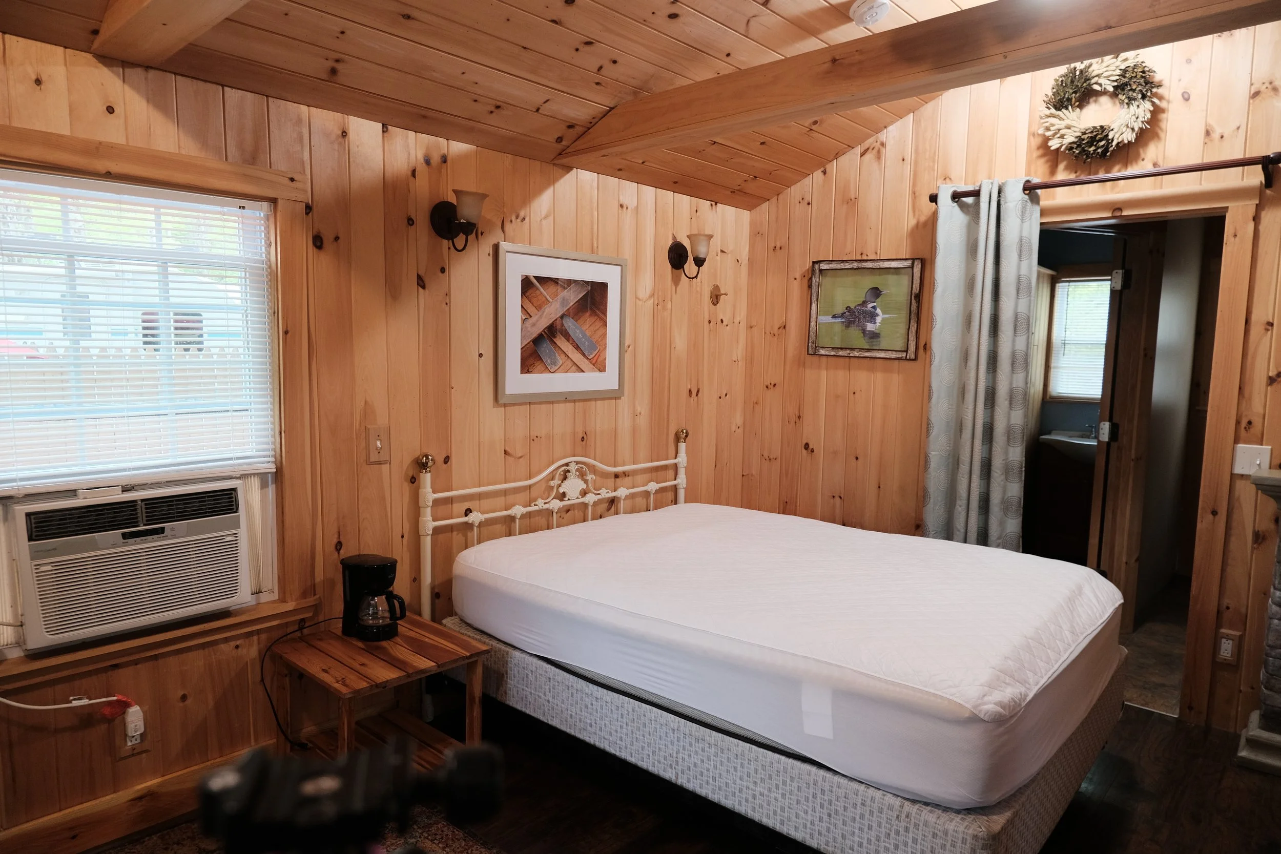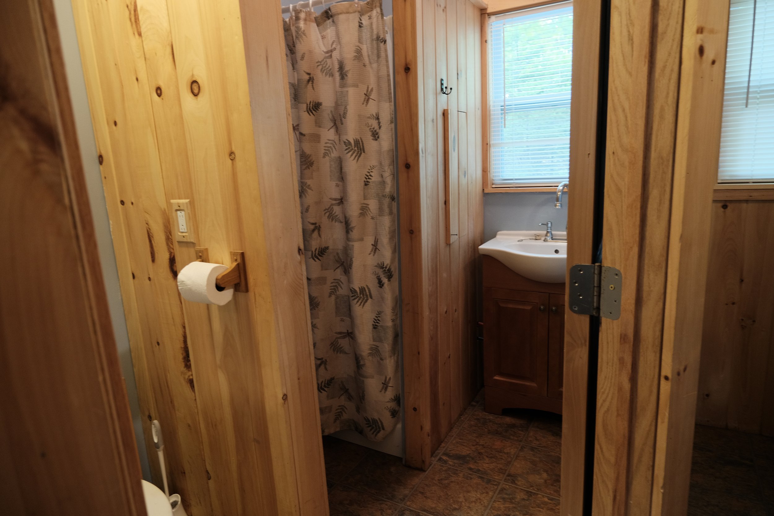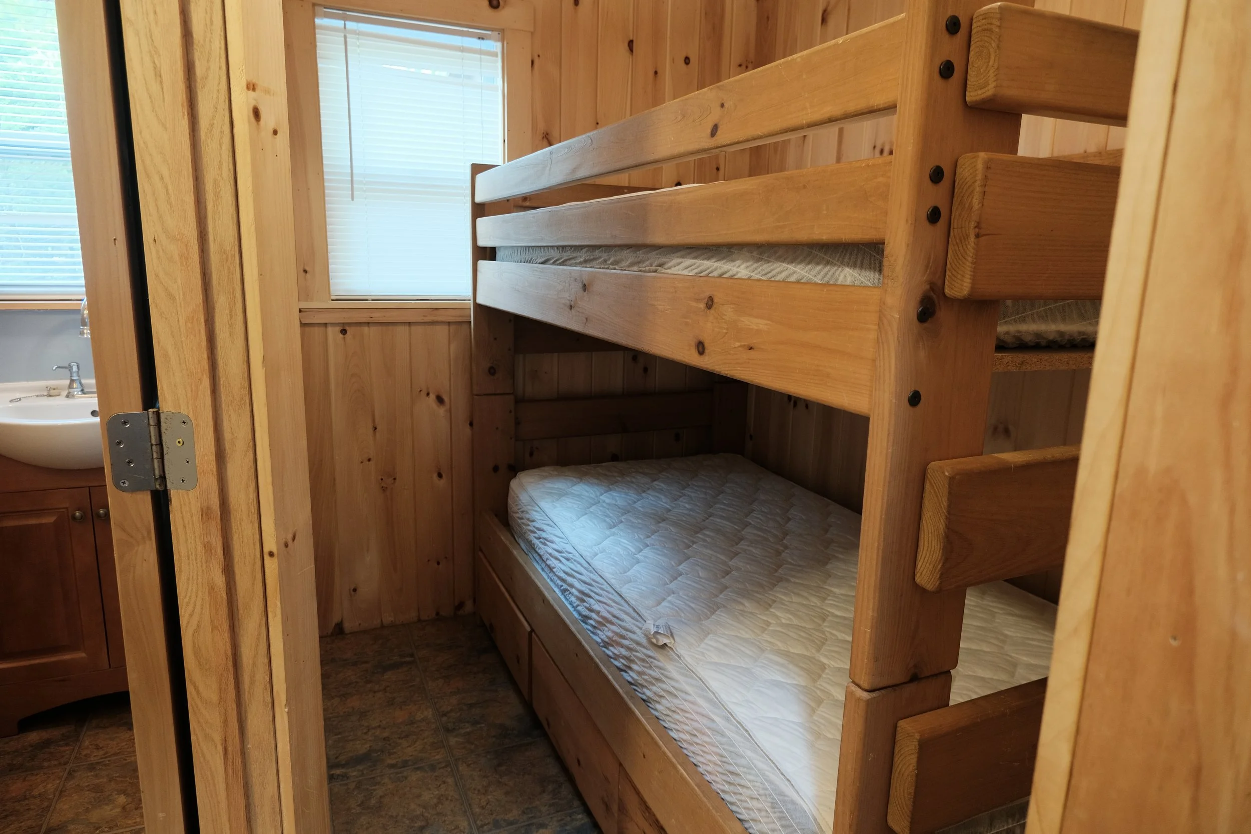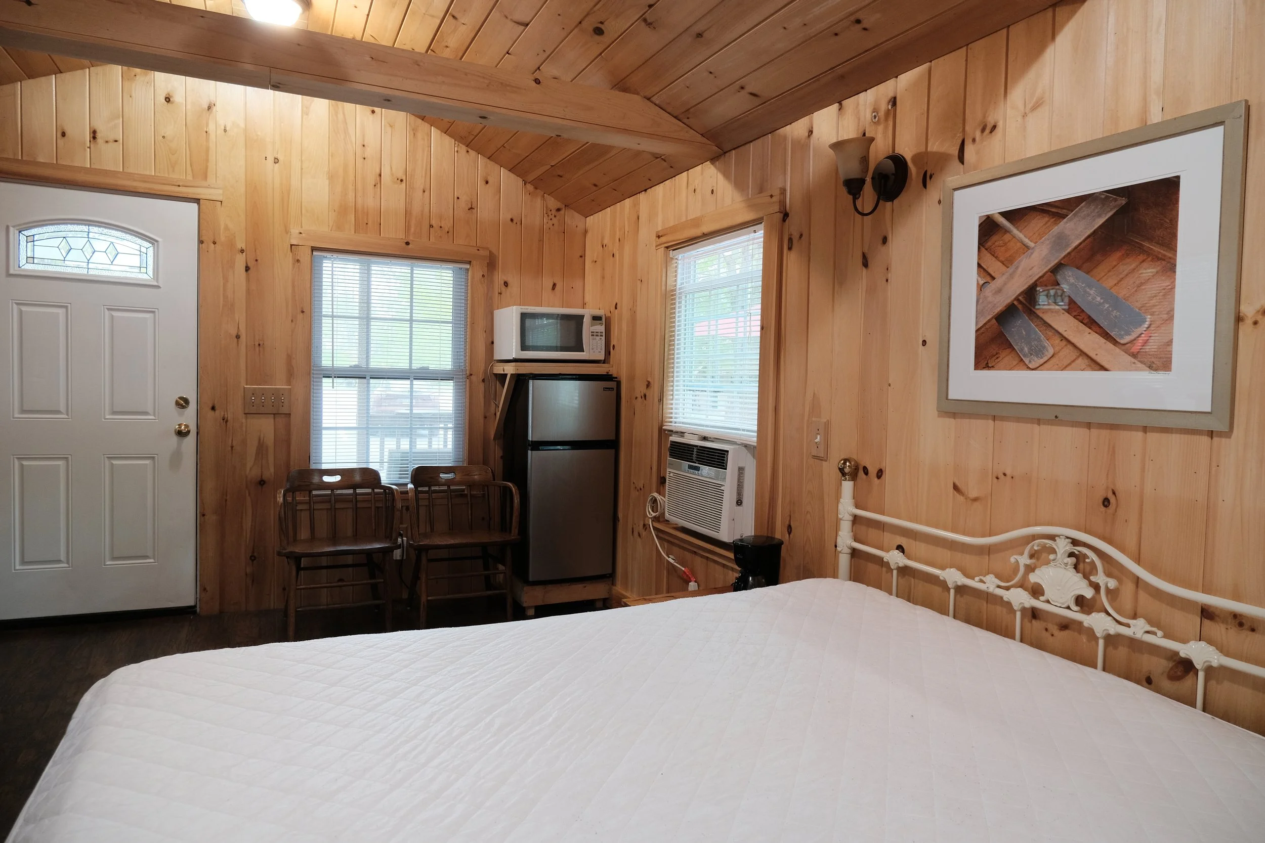 The Rainy Weather Cabin is a cozy retreat offering comfortable accommodations for guests. It features a Queen bed and bunk beds, along with a private bath that includes a shower. The cabin is equipped with a heat/air combo unit to ensure a pleasant temperature all year round. For convenience, it includes a small refrigerator and microwave, as well as a small table inside. The cabin does not allow pets. Essential amenities such as electricity, sewer, and water are provided.