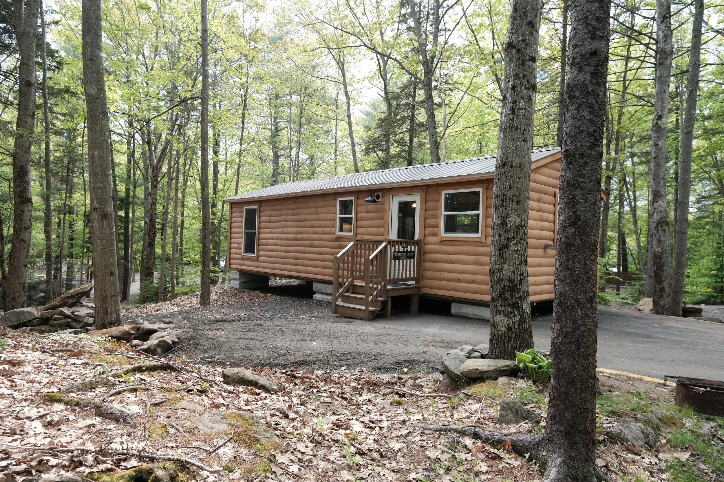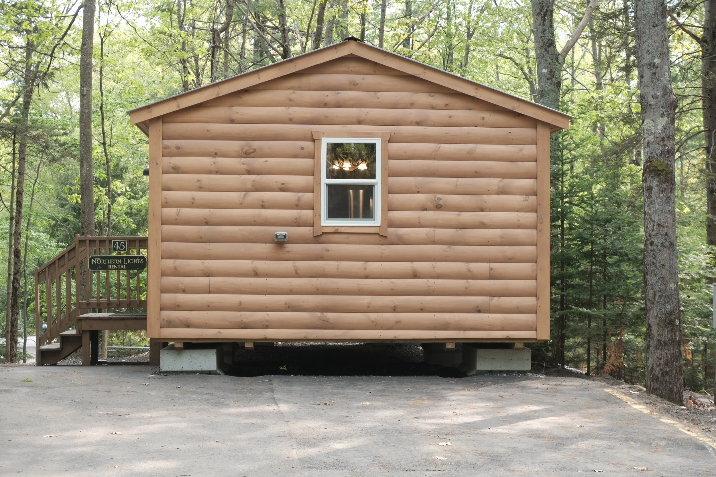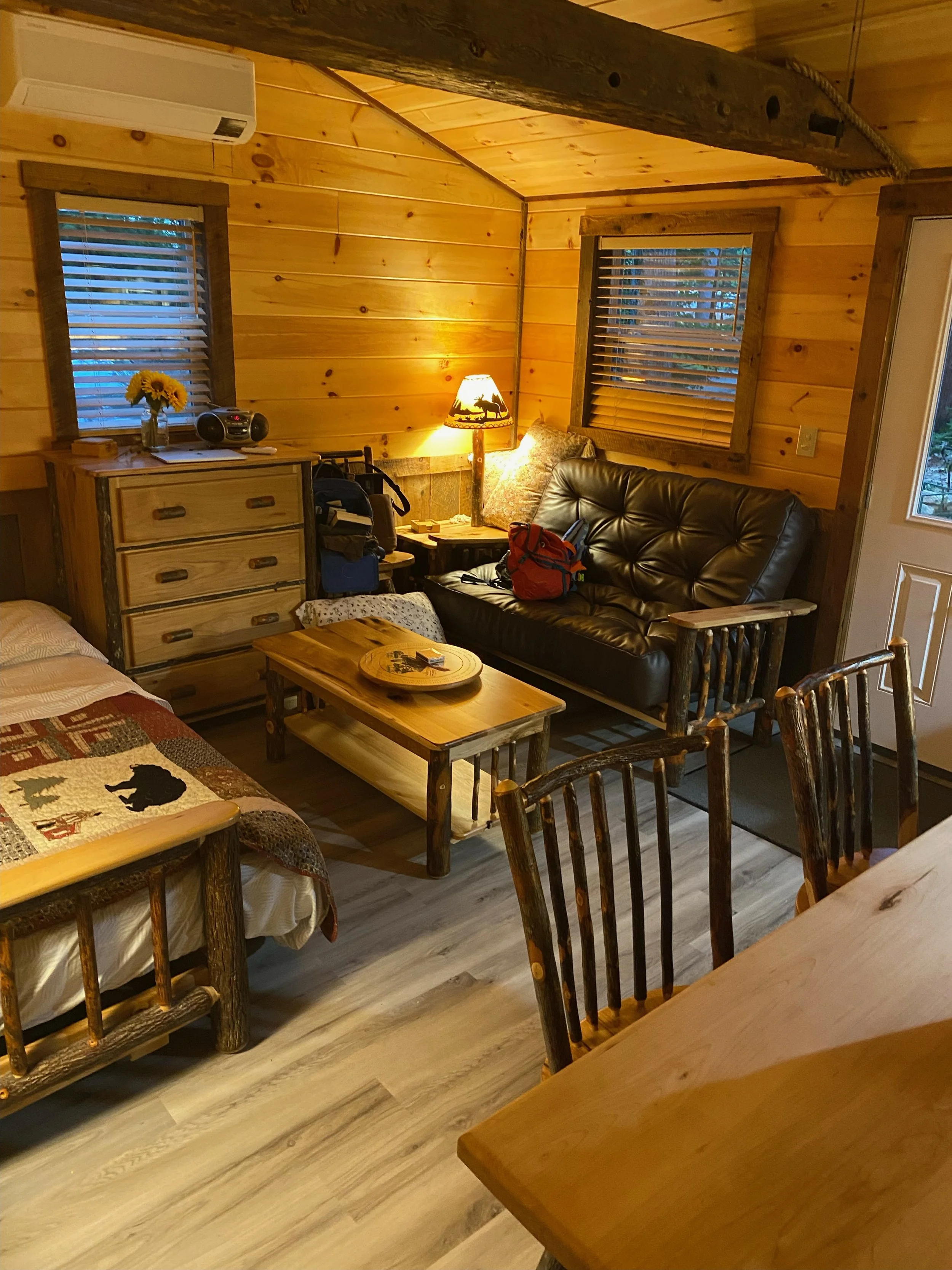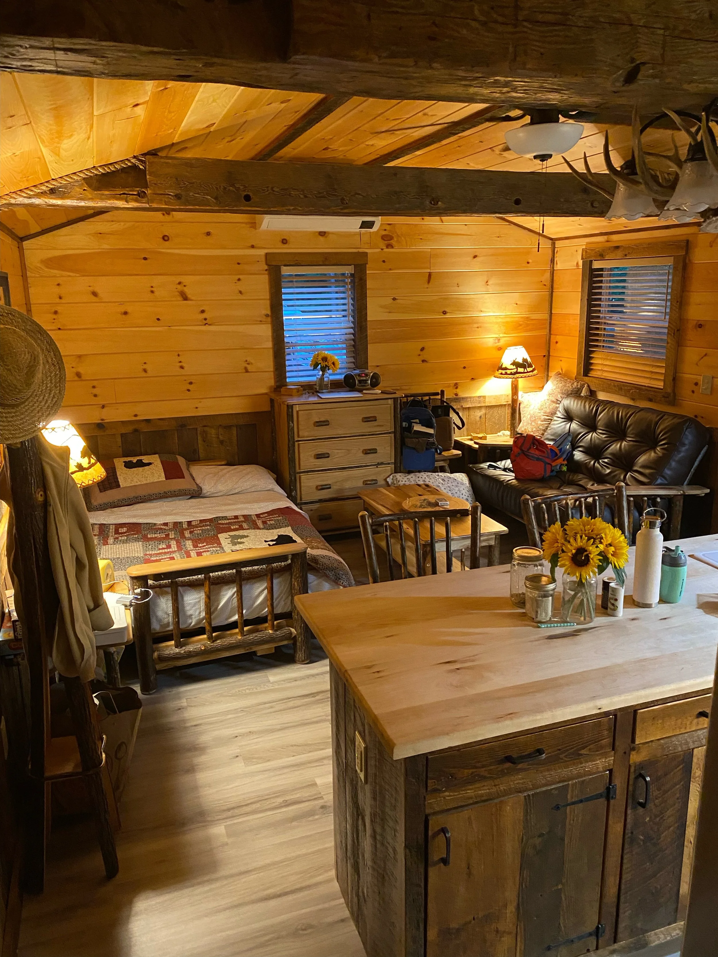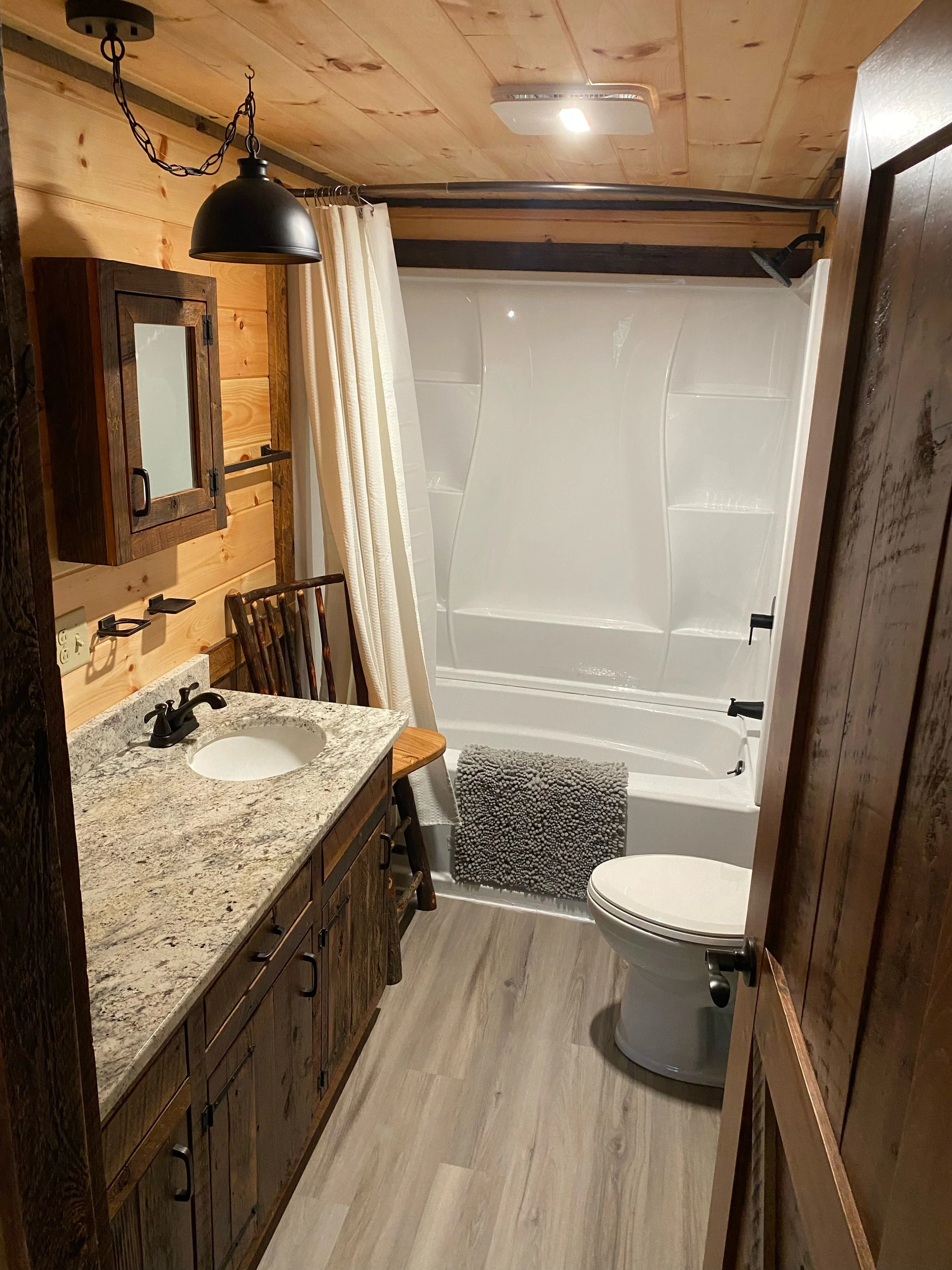 Our new luxurious Amish built tiny home rental is the perfect getaway for you and your family! It features a full kitchen, a full bathroom, a master suite, and a large living room with big leather couches that convert into a bed! Check out the photos and book your stay today.